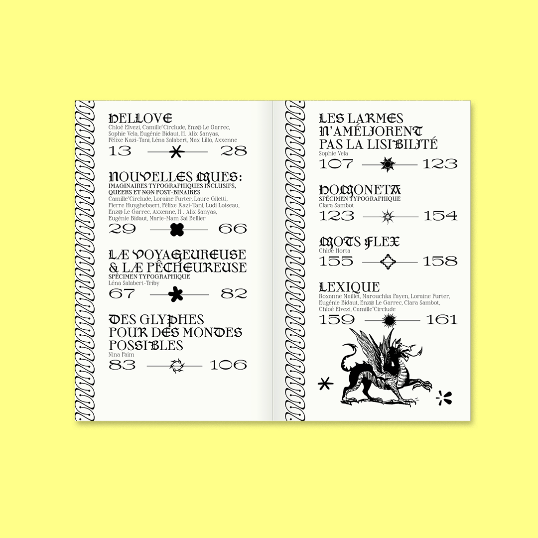 • deux mises en scène graphiques des libertés formelles adoptées par la collective pour entrelacer les glyphes dans une perspective post-binaire. Clara Sambot et Léna Salabert Triby y déploient tout le potentiel des caractères dessinés par la collective.
