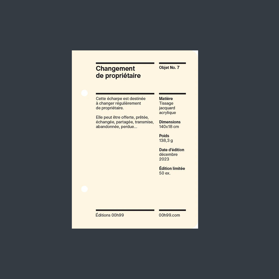Cette écharpe porte sur elle sa propre destinée, changer indéfiniment de propriétaire. Elle peut être offerte, prêtée, échangée, partagée, transmise, abandonnée, volée, perdue…