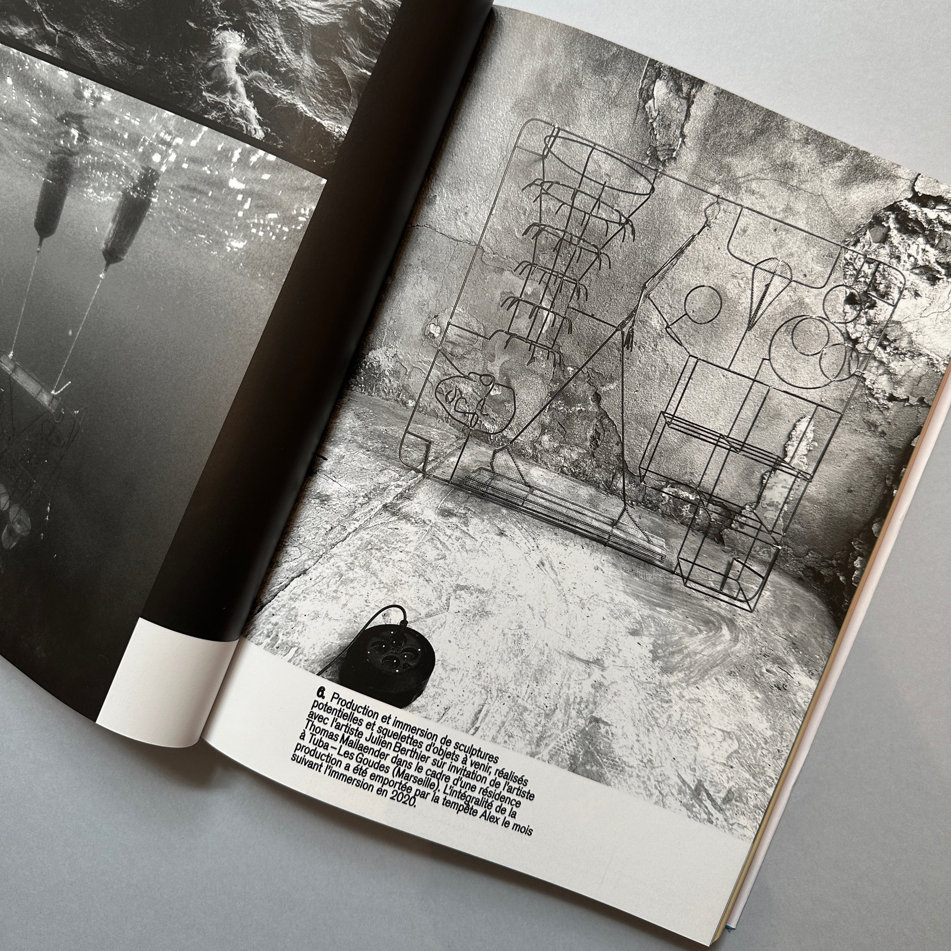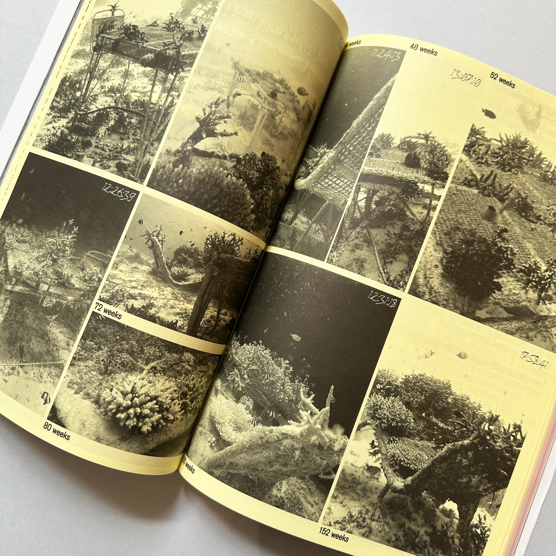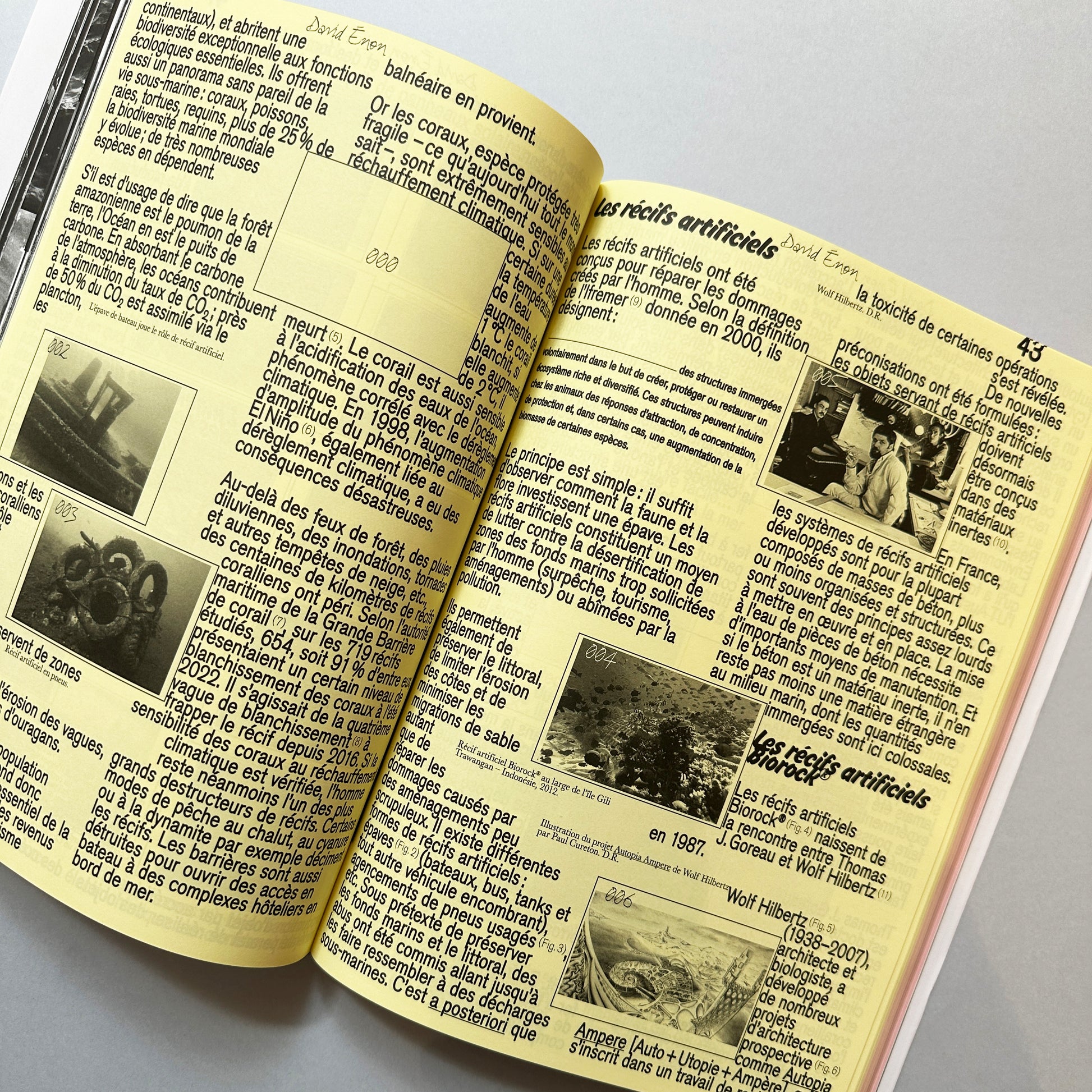 Mineral Accretion Factory est un projet du designer David Enon, mis en page et en récit par l’artiste et graphiste Jean-Marc Ballée. C’est en immergeant les squelettes de meubles colonisés peu à peu par le corail, que le designer produit. L’ouvrage retrace le parcours qui permet de concevoir du mobilier et d’aménager des plages et des espaces publics. Il évoque les problématiques de réparation du corail et de protection des côtes. Ce système de production alternative, low et slow tech (technologie de lente et basse intensité) est respectueux des rythmes biologiques et des capacités naturelles de production de la mer. Son impact sur l’environnement est positif. La relecture visuelle inattendue du designer et de l’artiste-graphiste ouvre vers des imaginaires marins et sous-marins très cinématographiques. Les préoccupations du designer rencontrent aussi les savoirs situés des scientifiques et la fantaisie du graphiste.