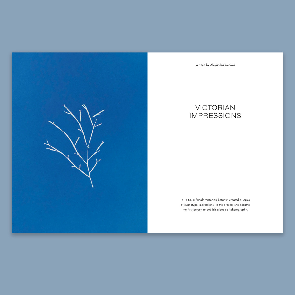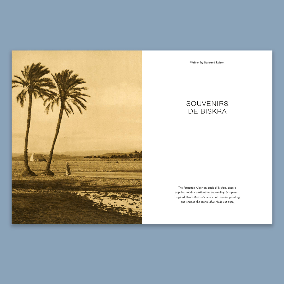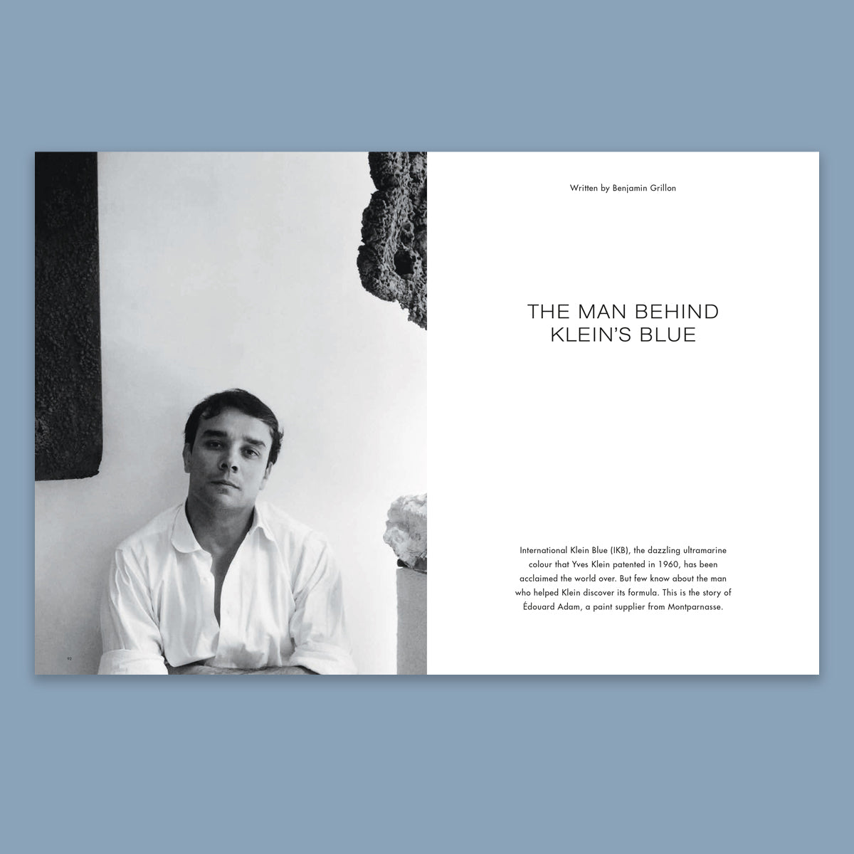 "Il ne s'agit pas d'une autre publication sur la signification de la couleur. Celle-ci n'a pas été abordée de manière littérale, mais plutôt comme un point de départ, un prétexte pour raconter de plus grandes histoires, un moyen de révéler l'histoire dans l'histoire : nous connaissons tous les Nus bleus de Matisse, mais qui peut en dire autant de Biskra, l'oasis algérienne oubliée qui l'a inspiré ? On connaît peut-être aussi le pigment outremer qu'Yves Klein a breveté, mais qui a entendu parler d'Edouard Adam, un quincaillier de Montparnasse qui a découvert sa formule ?"