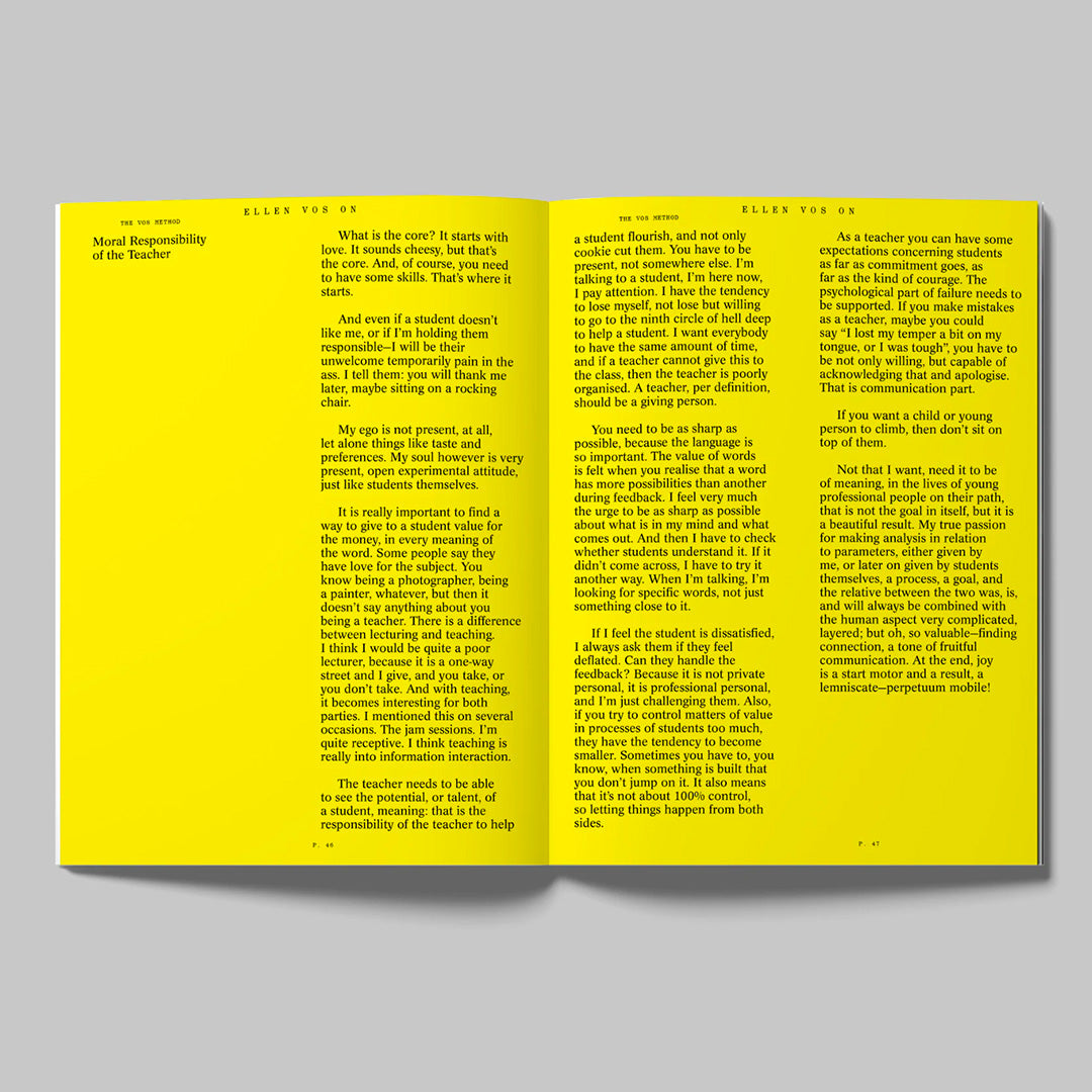 Art education is not just about teaching skills; it is about shaping perspectives, nurturing creativity, and preparing students to make meaningful contributions to society. Central to Vos’s method is trust. She emphasises the importance of students trusting her guidance and embracing the process by “taking a plunge into a jam session.” “One plus one is bigger than two,” she often says, meaning that each component must be a strong entity for the team to become a cohesive whole. By meticulously choosing her words, Vos offers feedback and advice “not to put you down, but to lift you up.” These are just a few of Ellen’s “golden sayings” featured in this publication, together with over 40 assignments she had constructed over the years. Developed in collaboration with Medina Resic, this book serves both as an archive and a guide—a collage of resources for anyone dedicated to art education.